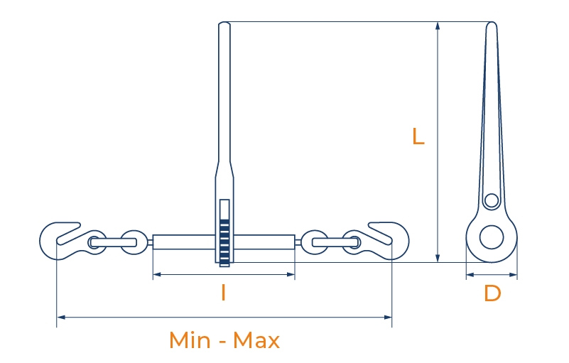 | Tip | Zincir Ölçüsü | D | L | I | Min | Max | Bağlama Yükü | Kopma Yükü | Ağırlık | |||||||||||||||||||||